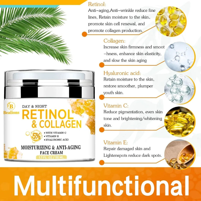 Formulated with powerhouse ingredients like Retinol, Collagen, and Hyaluronic Acid, this cream targets fine lines and wrinkles by promoting cell turnover, improving elasticity, and deeply moisturizing the skin for a smoother, firmer appearance.